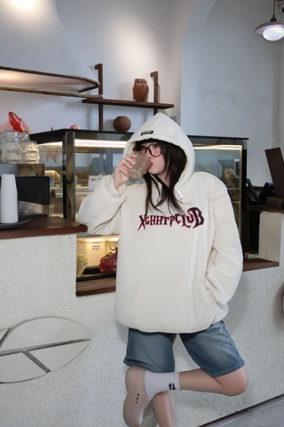Hoodie nỉ be + chân váy ngắn + tất cao cổ + boot