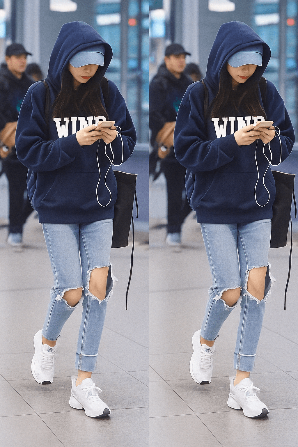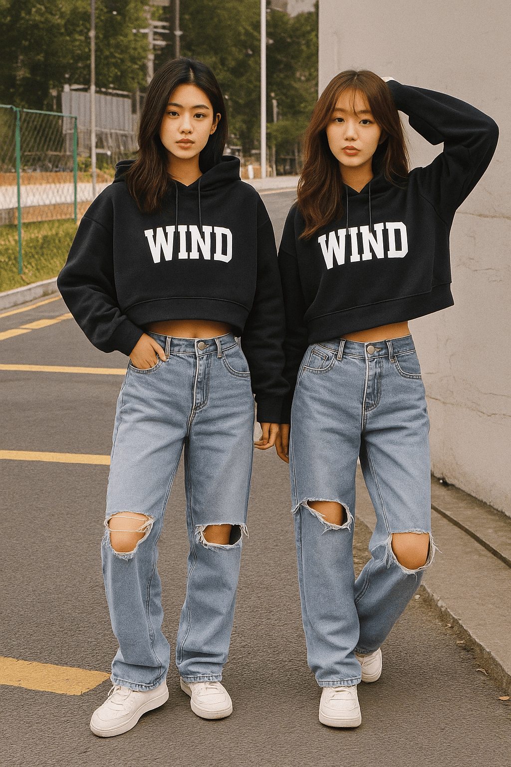 1. Outfit hoodie rực rỡ + quần jean rách: Cá tính và phá cách